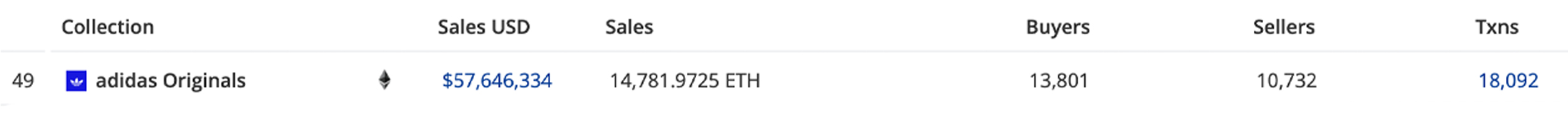 Adidas Originals NFT Compilation Enters Top 50 Collections by Volume, Close to $60M in Sales in 18 Days