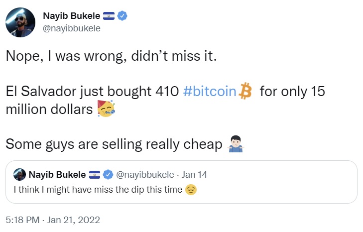 In the same tweet, Bukele also stated that he did not miss the dip after all. “Nope, I was wrong, didn’t miss it,” the Salvadoran president wrote in response to his own tweet on Jan. 14 that says, “I think I might have missed the dip this time.”