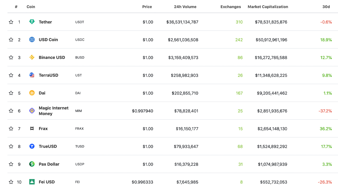 The tenth-largest stablecoin, fei usd (FEI), has decreased by 26.3% this past month. Both FRAX and USDC saw the largest increases last month.