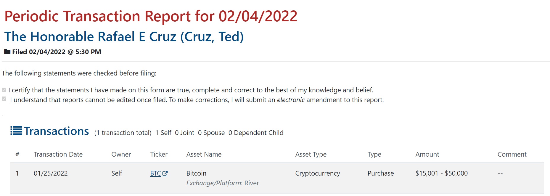 U.S. Senator Ted Cruz has bought the bitcoin dip. A Periodic Transaction Report filed on Friday shows that the senator from Texas personally bought bitcoin worth between $15,001 and $50,000 on Jan 25.