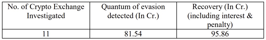 He revealed that 11 cryptocurrency exchanges were investigated and tax evasion in the amount of 81.54 crore rupees were detected. The tax authority has recovered 95.86 crore rupees, including interest and penalty.