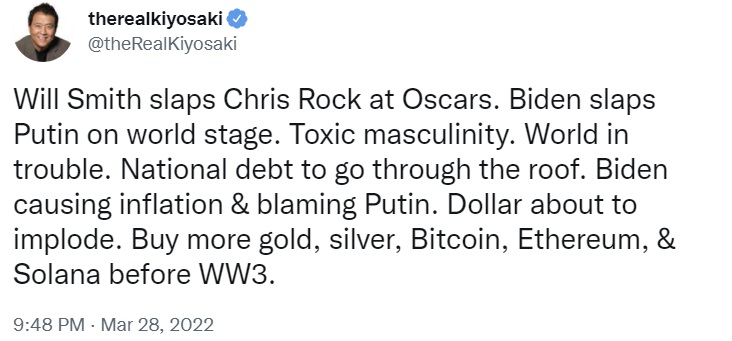 Despite his crypto recommendations, Kiyosaki warned earlier this month that the government will seize all cryptocurrencies after they launch a “Fed crypto.” Nonetheless, he subsequently said that the Russia-Ukraine war has given rise to crypto as a safer haven than fiat money.