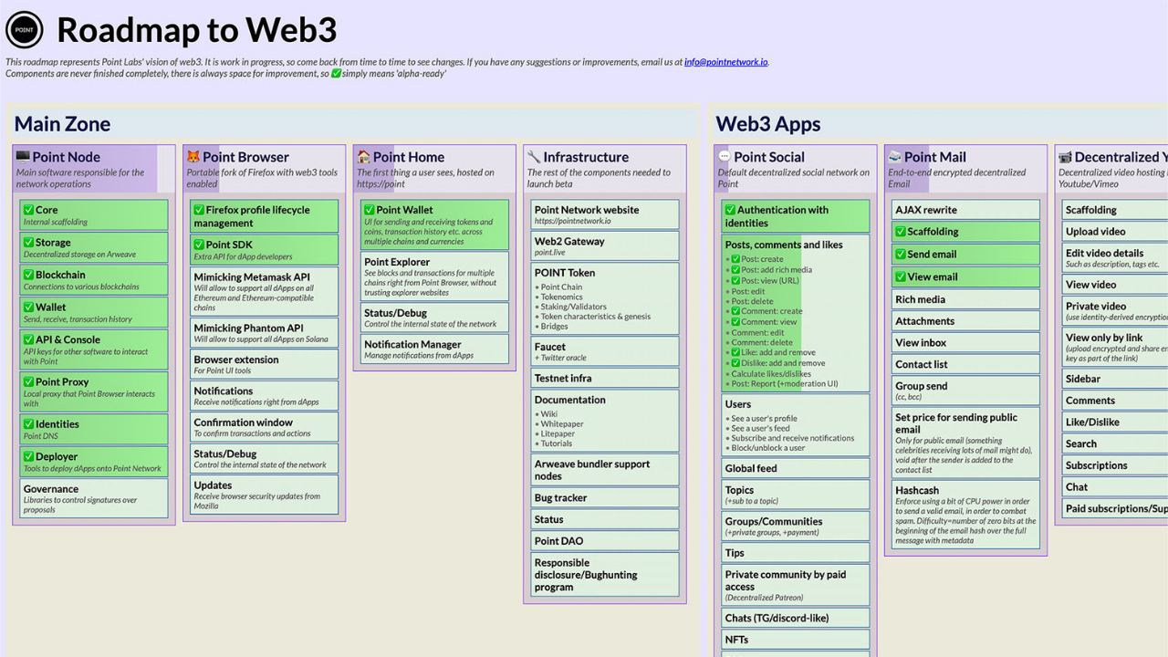 This week, Point Labs presented their roadmap. And it’s not just a typical ribbon-shaped block on a landing page. Instead, they made it into a whole Trello-like website, which is hosted on roadmap.pointnetwork.io, called “The Roadmap to Web3 ” and is frequently updated. It features two zones: the main zone, presenting the infrastructure required for decentralized internet and is almost done, and the dApp zone, listing use cases and potential decentralized applications for when the main zone is ready and operational.
