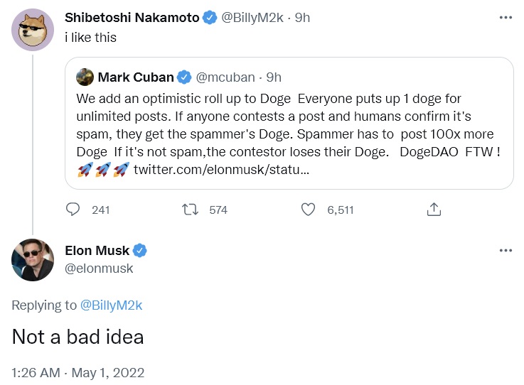 Elon Musk, Mark Cuban Discuss Using Dogecoin to Solve Twitter Spam Problem