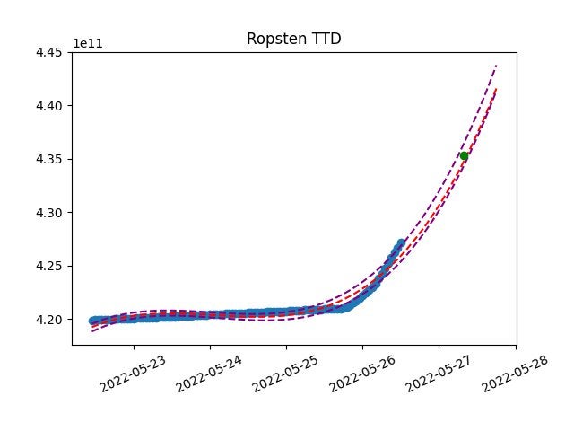 Miners on Ropsten have added more GPUs to the network, pushing the expected TTD (aka merge date) to be hit May 27, instead of June 8.