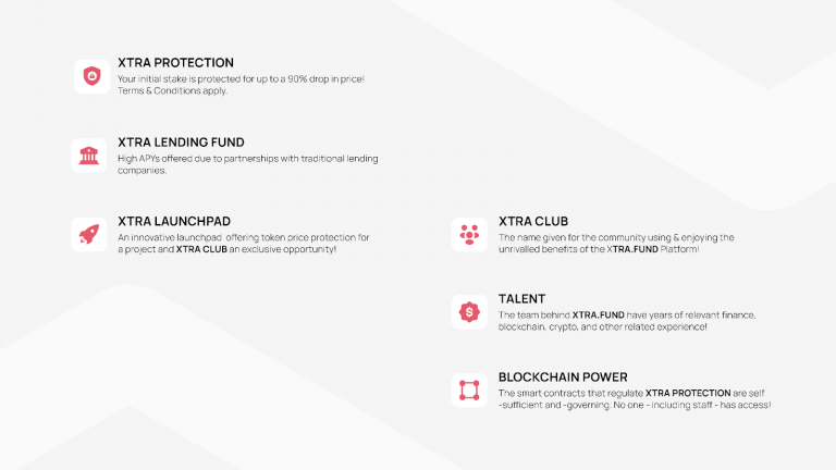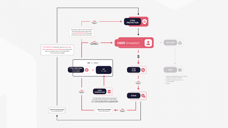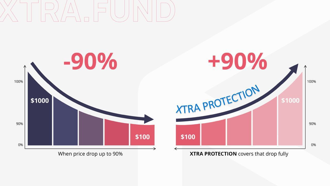 The outcome? When a user stakes XTRA.FUND Tokens on the XTRA.FUND Platform, their initial staked amount is protected against a price drop of up to 90% (terms such as staking length apply). That is unheard of in not only the decentralized finance but also the traditional finance space.