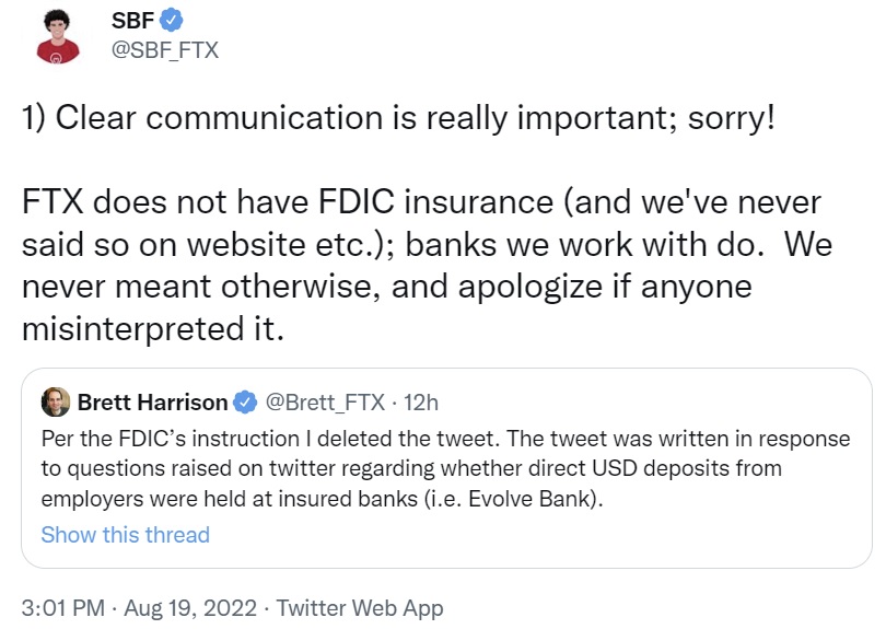 Bankman-Fried apologized for the confusion regarding FDIC insurance on Twitter. “Clear communication is really important; sorry!” he tweeted. “FTX does not have FDIC insurance (and we’ve never said so on website etc.); banks we work with do. We never meant otherwise, and apologize if anyone misinterpreted it.” In a follow-up tweet, he stressed: “To be clear, FTX US isn’t FDIC insured.”
