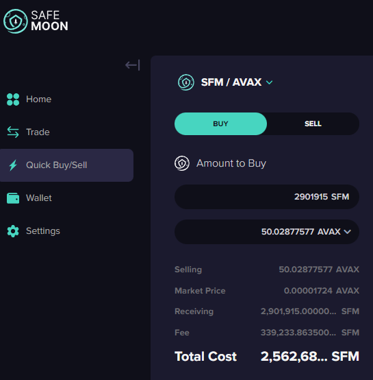 Safemoon just published some figures of example trades on their upcoming exchange, including wisely selling some Safemoon for AVAX – a real (if not flawless) Cryptocurrency. The eagle-eyed among you may have spotted the trading fee, and the mathematically inclined can work out the percentage of that trade, minus the 10% Safemoon buy/sell tax, and, yep, that's a 1.69% fee to trade! The lowest in the business!*