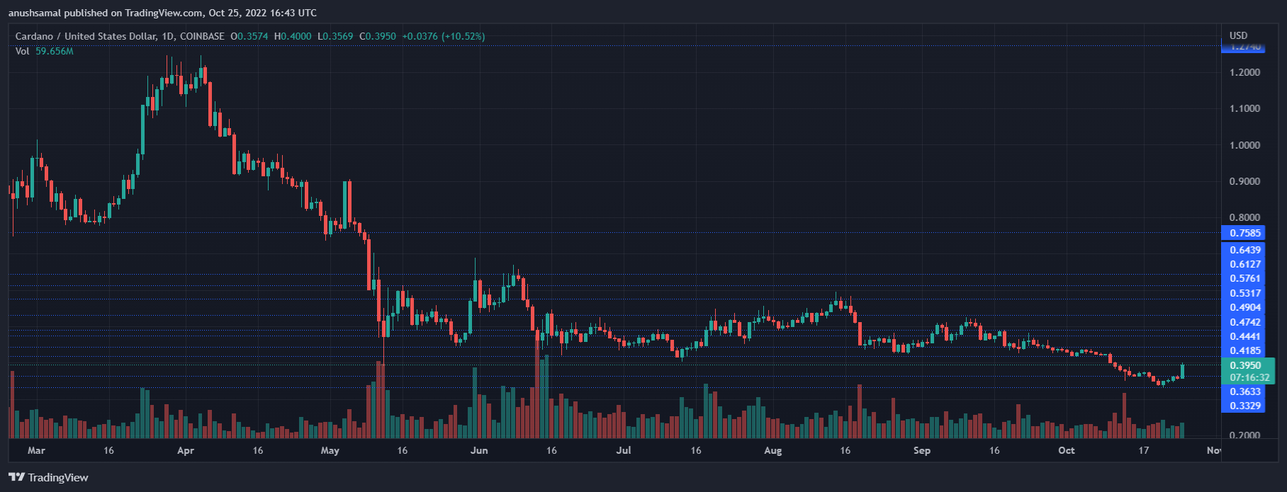 ADA was trading at $0.39 at the time of writing. The coin picked up bullish momentum the moment it crossed the $0.36 price mark.