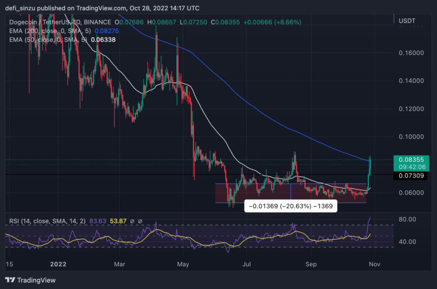 The price of Dogecoin (DOGE) has been one of the standout performers during the past few days, gaining the attention of many traders with the news of Elon Musk finalizing the ownership of Twitter becoming an increasingly fundamental to propel the price of Dogecoin (DOGE) to $0.1. The past few days have seen the crypto market has looked more decent, with the likes of Bitcoin (BTC) and Ethereum (ETH) showing some great price movement in recent times. DOGE’s price rallied from $0.05 to a region of $0.085 as the price aims to take the market by its horn. (Data from Binance)