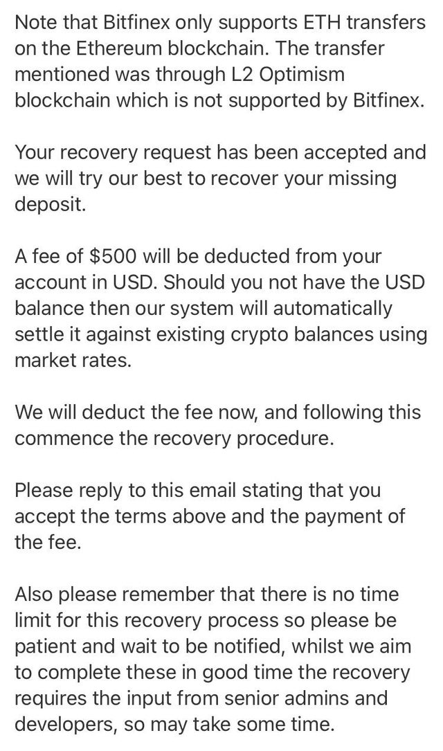 After not disclaiming their accepted chains Bitfinex is now requesting $500 for a “recovery fee” I cannot afford – can someone help?