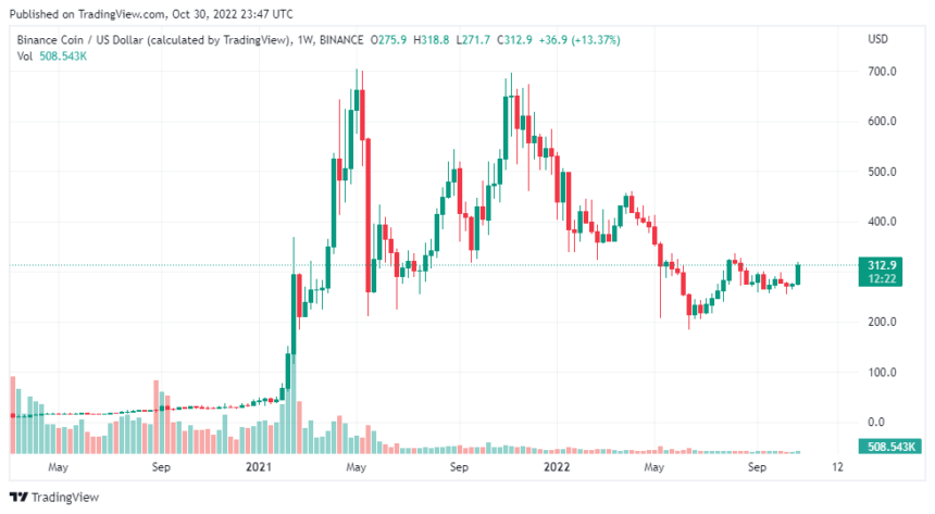 Binance Coin (BNB) has surpassed the $300 mark after its price surge over the week. The token was trading at around $274 per coin last Thursday and even threatened to fall lower as the week progressed. However, Tuesday saw the coin recover, adding around 5% profit to trade at $289.
