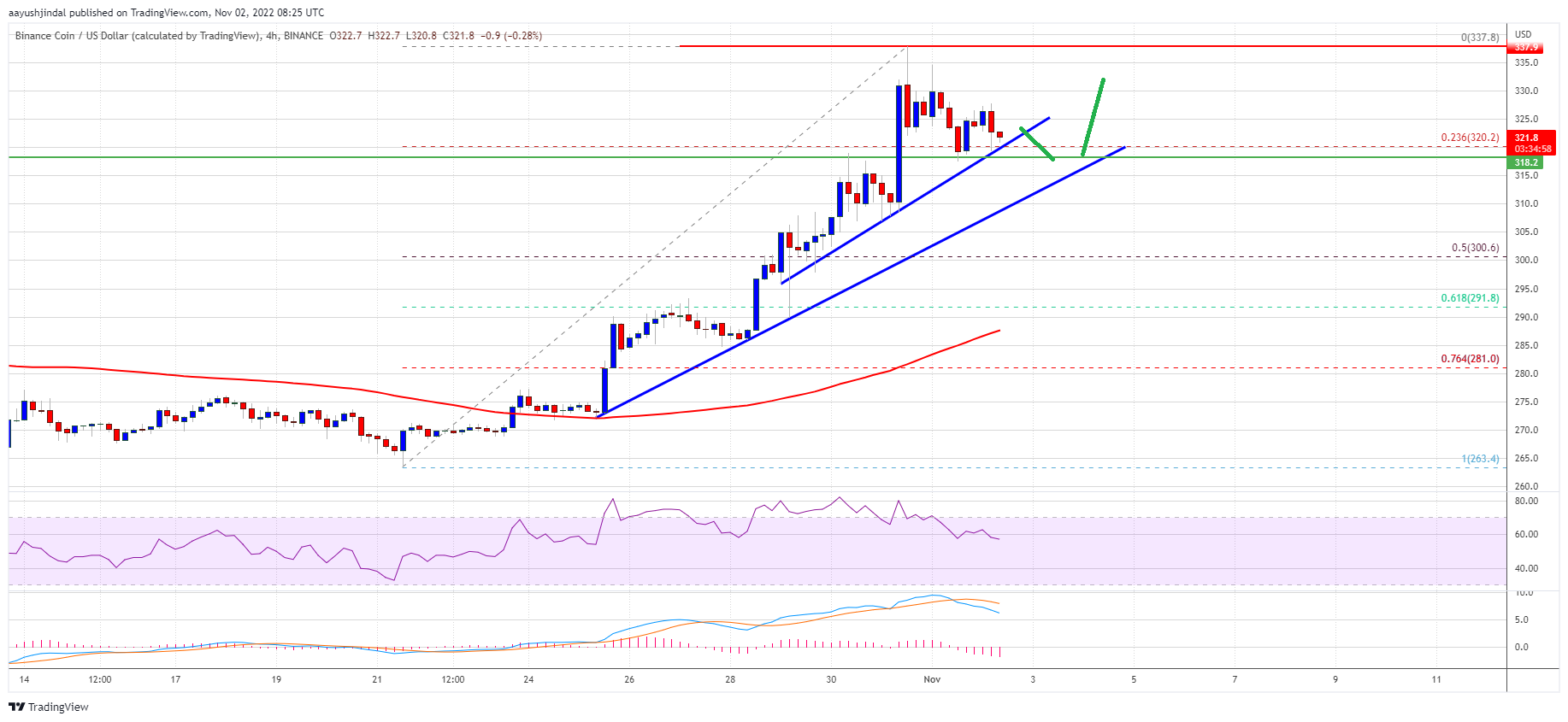 - There are two major bullish trend lines forming with support near $320 and $315 on the 4-hours chart of the BNB/USD pair (data source from Binance).