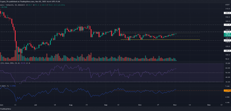 At the time of this writing, according to tracking from Coingecko, the altcoin is changing hands at $149.10, going down by almost 1% over the last 24 hours.