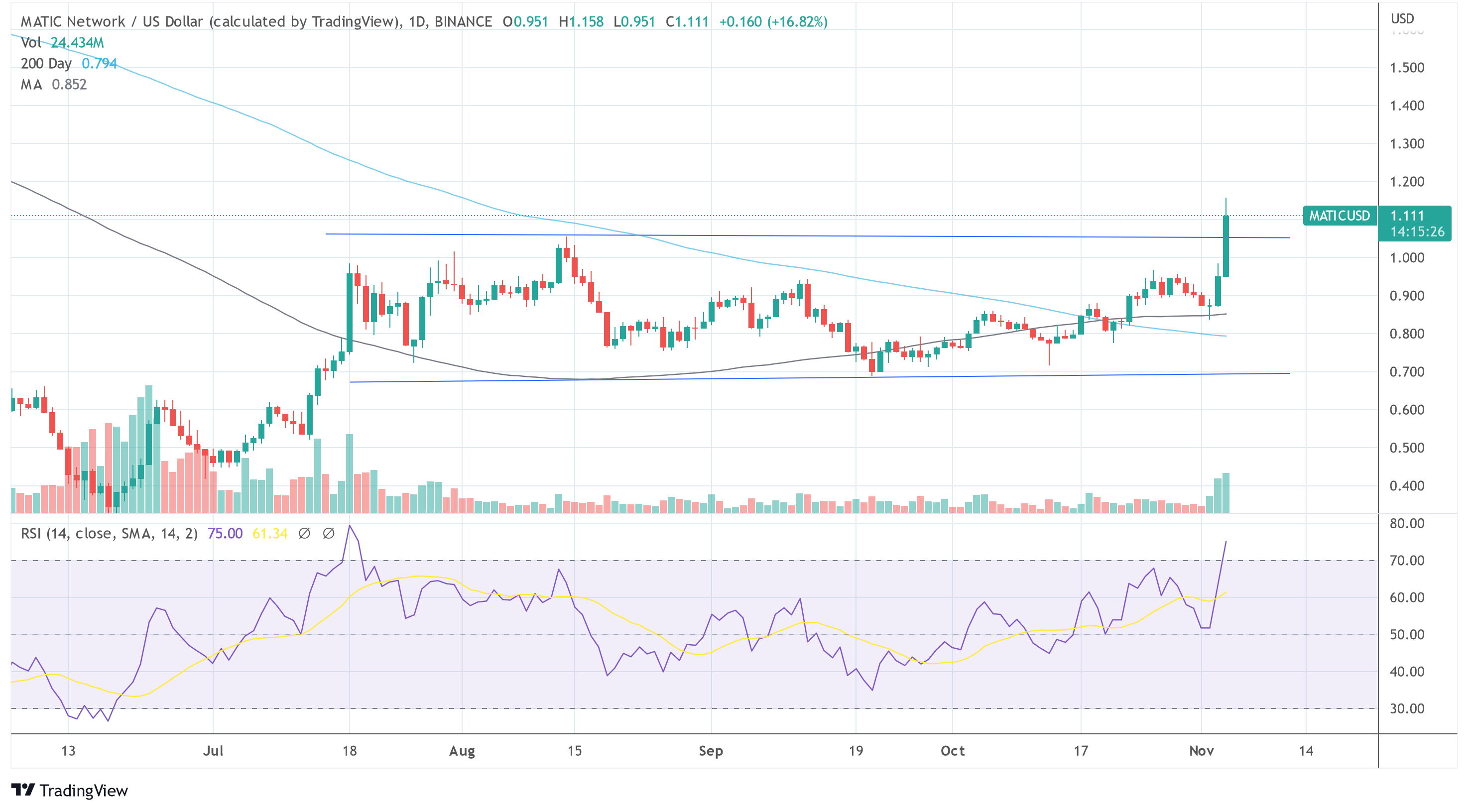 MATIC had been trading in a sideways channel since mid-July. After the golden cross formed on October 20, MATIC showed small strength. However, the explosive breakout from the sideways channel was triggered by fundamentals and probably whales scooping up MATIC.