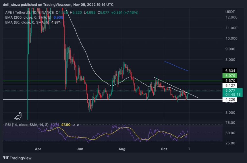 The price of APE trades at $5 above the 50 EMA, which indicates a good relief sign for APE’s price on the daily timeframe could be poised for a major breakout if prices close above $5.5 after facing rejection to trend higher.