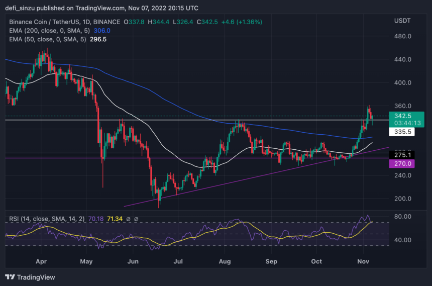 The price of BNB was rejected from its resistance of $335 after successive trials but was able to break and close above it, rallying to a high of $350 before facing resistance to a region of $400.