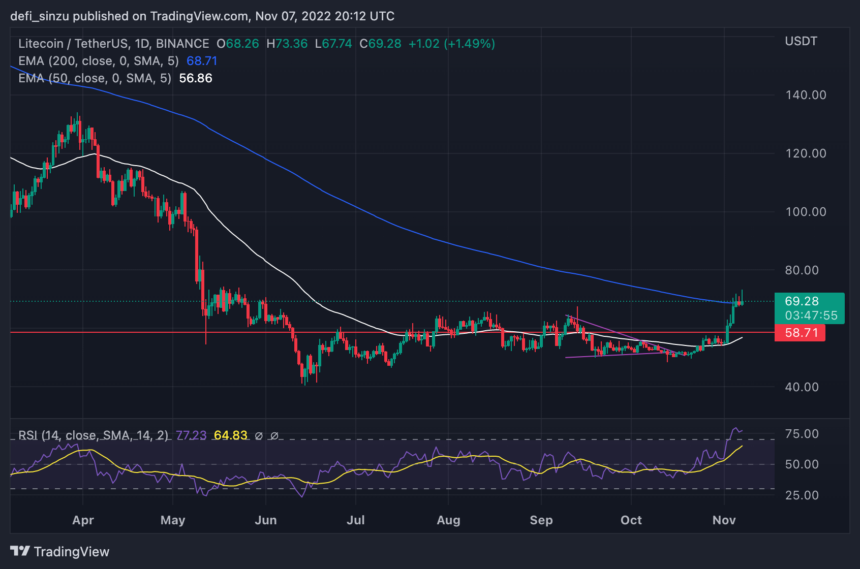 LTC has formed a bullish pattern after breaking out of a range channel and forming support at $65. If LTC holds this support area and as the market bounces to the upside, we could see the price of LTC retesting $90-$100, acting as resistance for the price.