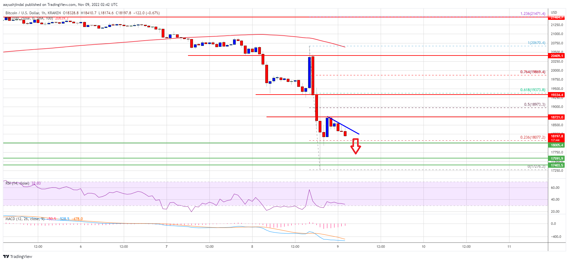 Bitcoin price declined over 10% and even spiked below $18,000. BTC remains at a risk of more losses, as the FTX faces more heat.