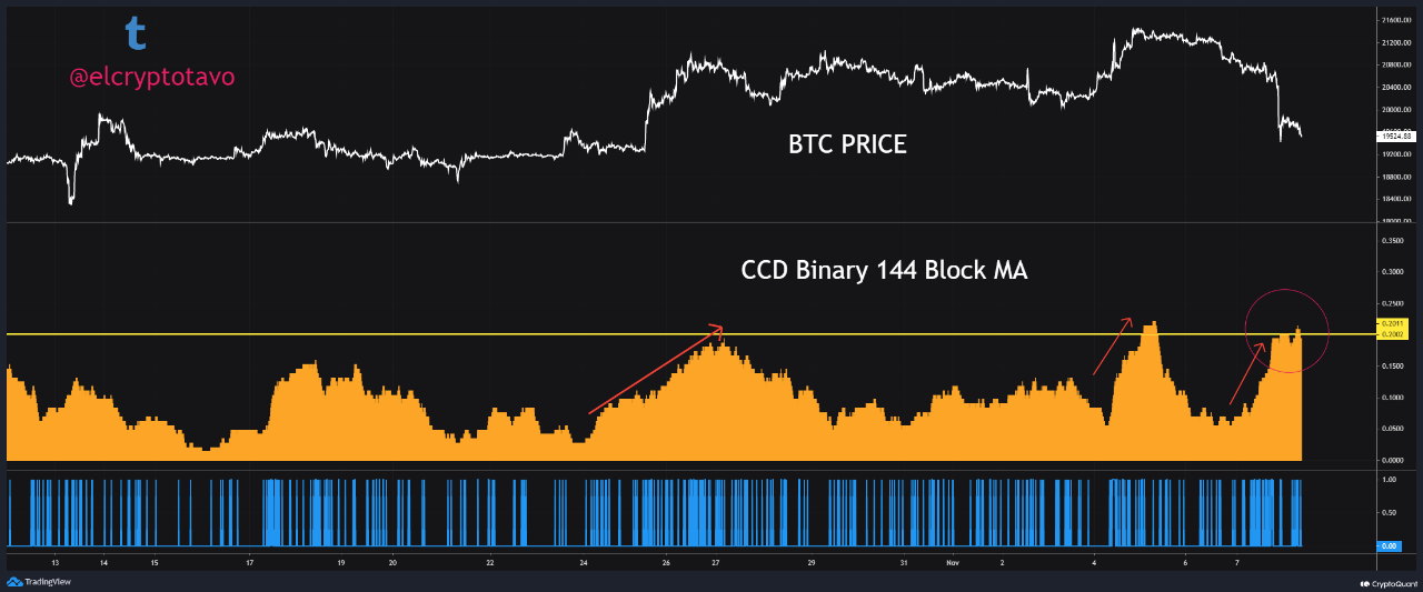 In the last 24 hours, the Bitcoin price plunged below $20k right after the CDD saw its surge, but as is apparent from the chart, the metric still hasn’t winded off just yet.