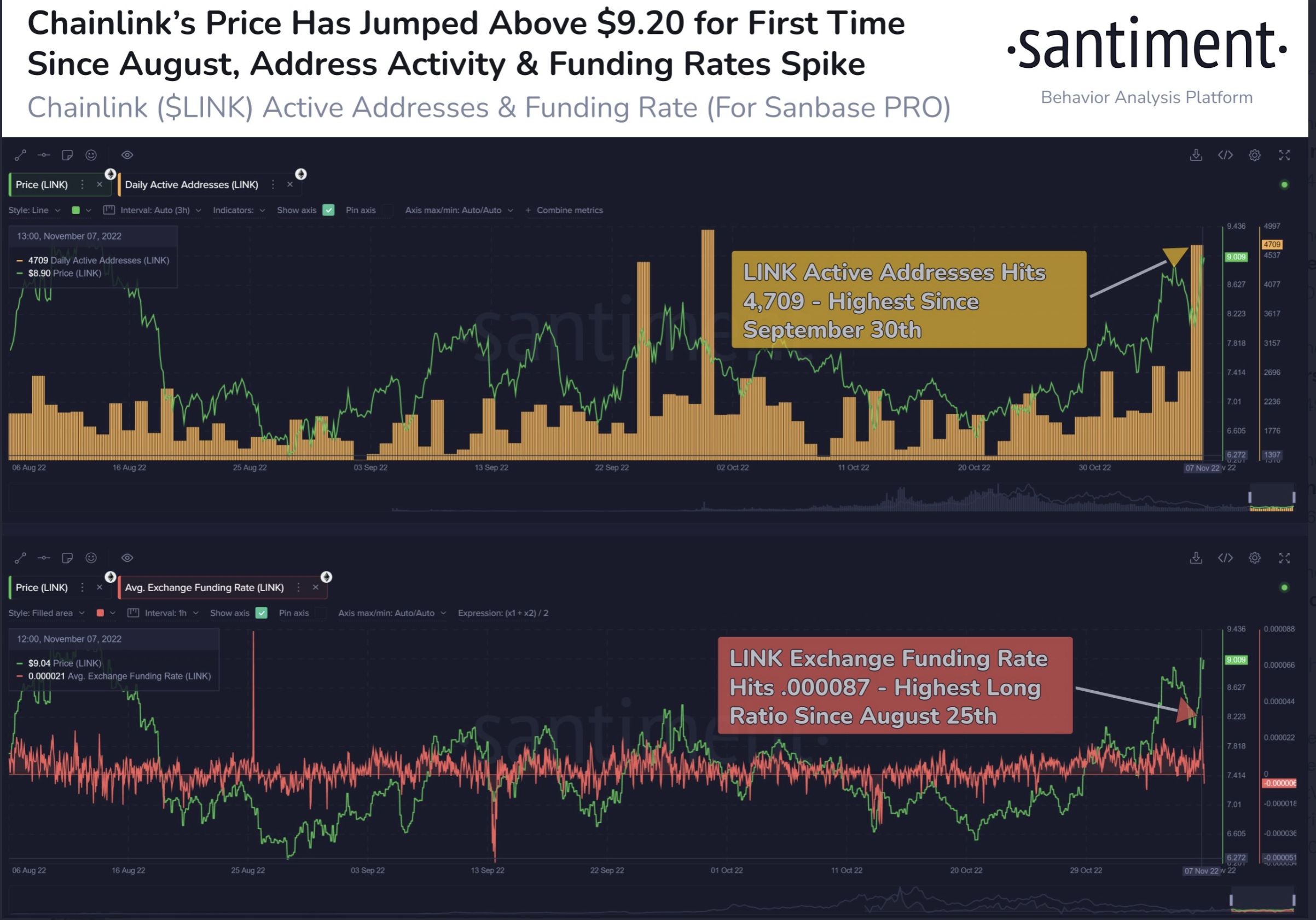 According to on-chain analysis service Santiment, the LINK price has risen to just above $9.20 for the first time since August 13, a 3-month high despite very volatile markets. The data aggregator believes the reason for the surge is the large volume of active LINK addresses for the past 5 weeks.