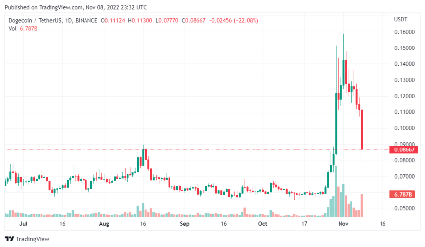 Meanwhile, the memecoins which have been in the limelight following Elon Musk’s Twitter acquisition are also down. For example, Dogecoin is faring much worse than Bitcoin and Ethereum, with approximately a 15% loss in valuation, while Shiba Inu (SHIB) dropped 8%.