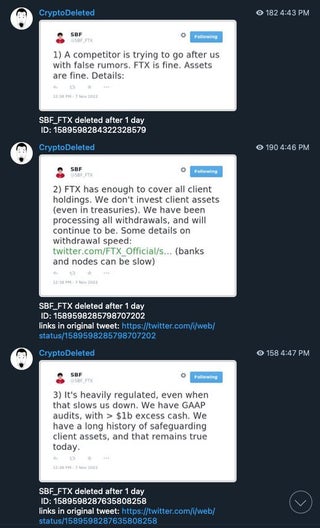 SBF deletes tweets from Monday which assured FTX was fine, had enough to cover client holdings and doesn’t invest client assets