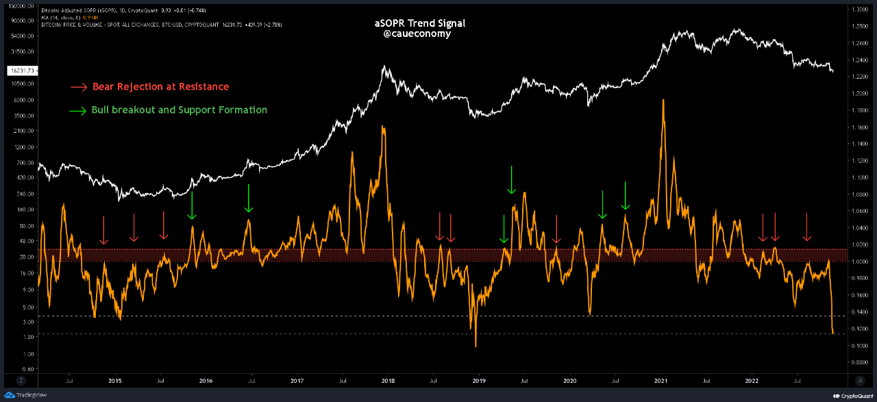 On-chain data shows the Bitcoin aSOPR metric has dropped to lows not seen since December 2018, suggesting that holder capitulation is deepening.
