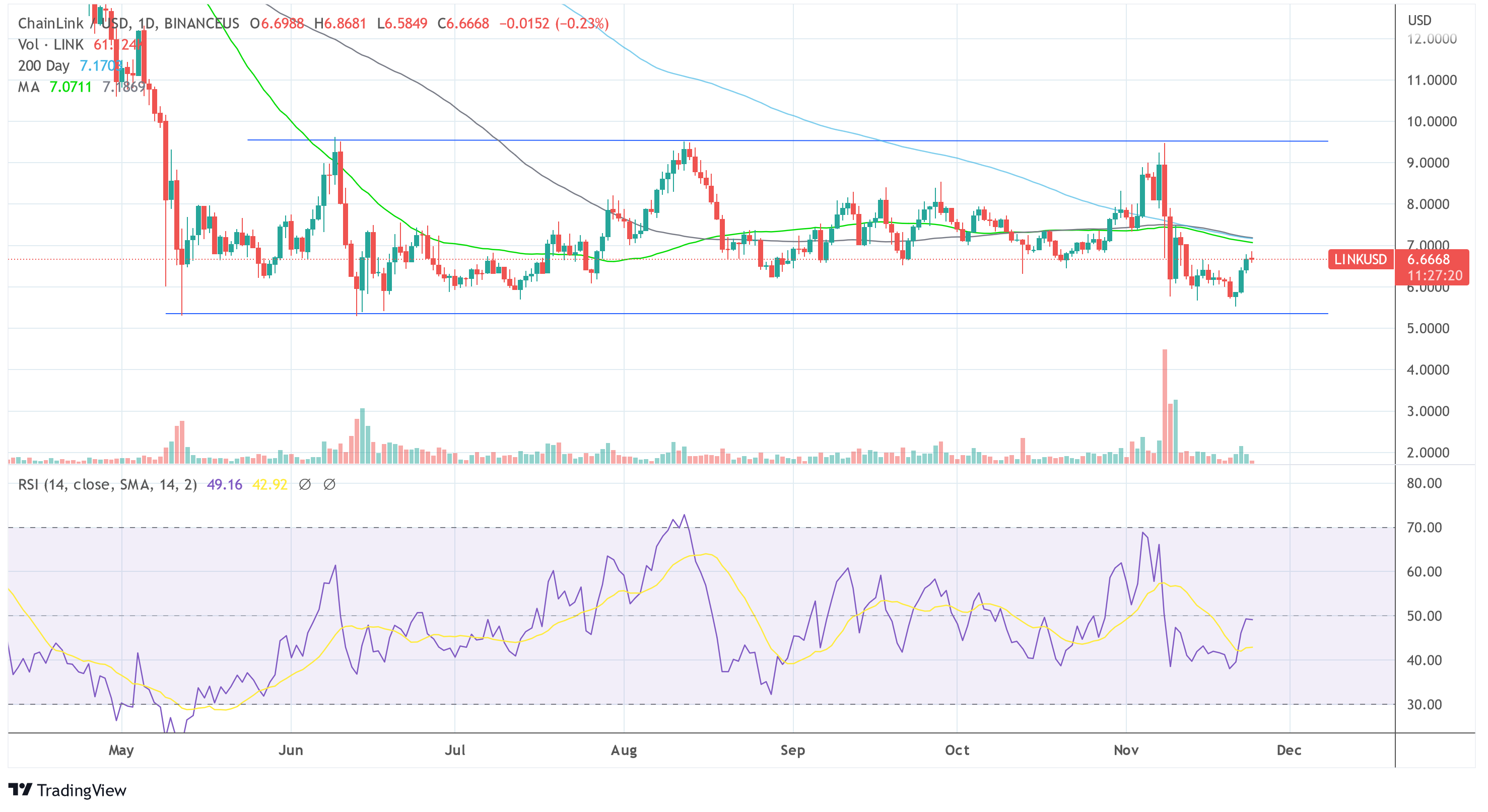 At the current price, LINK is hovering just below the 50-, 100-, and 200-day simple moving averages (SMAs). With an RSI of 49.5 in the 1-day chart, LINK is in neutral territory.