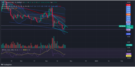 The token was previously rejected at $5.43, which was the price level breached by bears in the preceding days. Not to add the bearish crossover of the RSI indicators. A Bollinger Band compression zone is also enhancing this rejection.