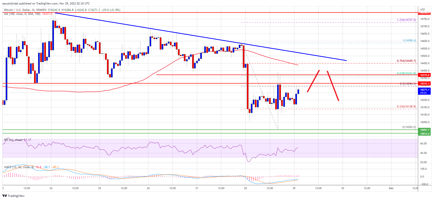 The price even moved below the $16,200 level, but the bulls were active near the $16,000 support zone. A low was formed near $16,000 and the price is now consolidating losses. There was a minor increase above the $16,200 level.