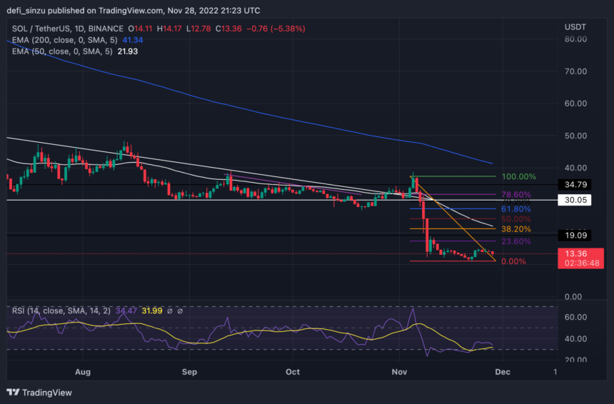Solana (SOL) continues to trade below $20 after facing rejection due to the FTX fiasco and the current market downtrend affecting the price to a low of $13.5.