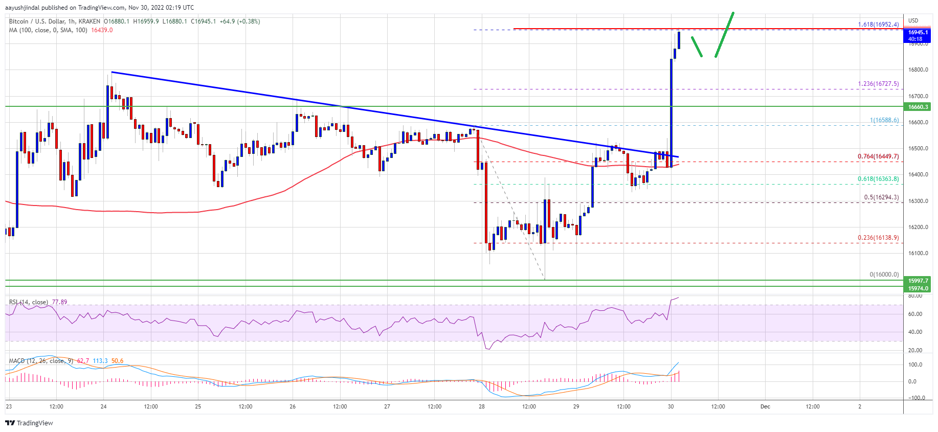 During the increase, there was a break above a major bearish trend line with resistance near $16,450 on the hourly chart of the BTC/USD pair. The pair even surpassed the 76.4% Fib retracement level of the downward move from the $16,589 swing high to $16,000 low.