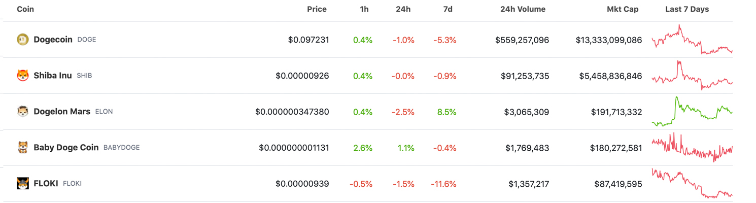 The list of top ten meme coin economy tokens today includes dogecoin (DOGE), shiba inu (SHIB), dogelon mars (ELON), baby doge coin (BABYDOGE), floki (FLOKI), kishu inu (KISHU), doge killer (LEASH), tamadoge (TAMA), catecoin (CATE), and samoyedcoin (SAMO).