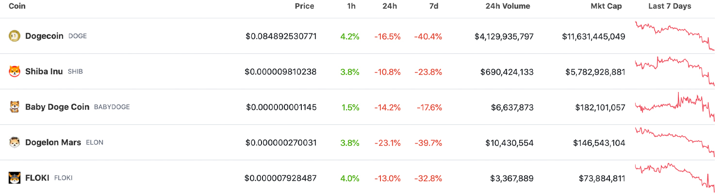 Dogecoin (DOGE) suffered a big loss that day dropping 16.5% against the U.S. dollar, according to an archive.org snapshot of coingecko.com stats on Nov. 9, 2022. The second largest meme coin in terms of market capitalization size, shiba inu (SHIB), shed 10.8% in value that day.