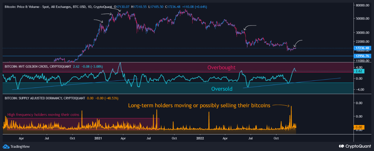 As pointed out by an analyst in a CryptoQuant post, the BTC long-term holders have been moving their coins recently. The “NVT ratio” is an indicator that measures the ratio between the Bitcoin market cap and the transaction volume on the chain (both in USD). What this metric tells us is whether the value of the cryptocurrency (the market cap) is comparable to the ability to transact coins or not (the volume).