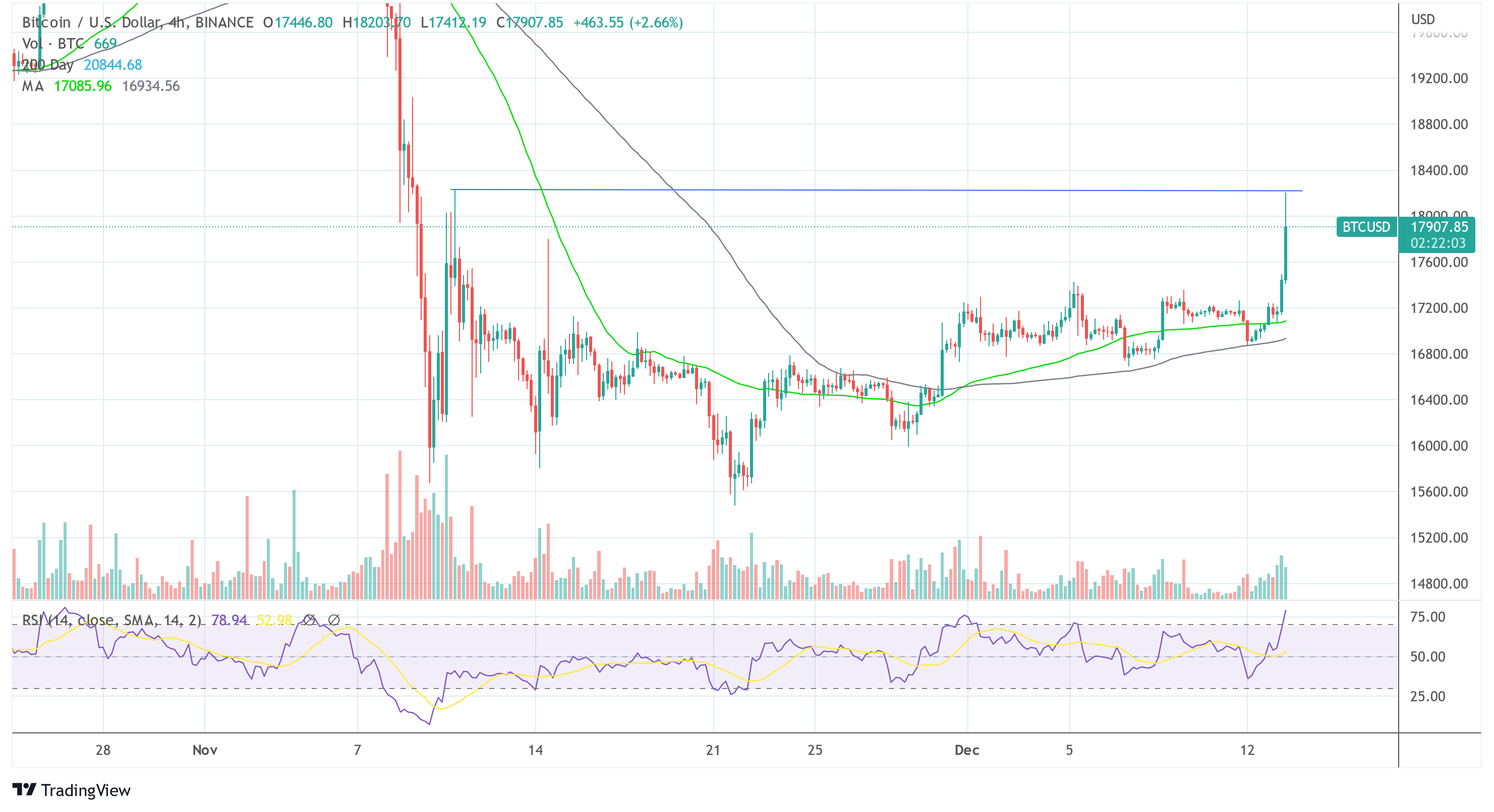 At press time, BTC was up almost 6% within the last 24 hours and was trading at $17,907. With a local high of $18,209, the price was rejected at the 2-month high of November 11 for the moment being.