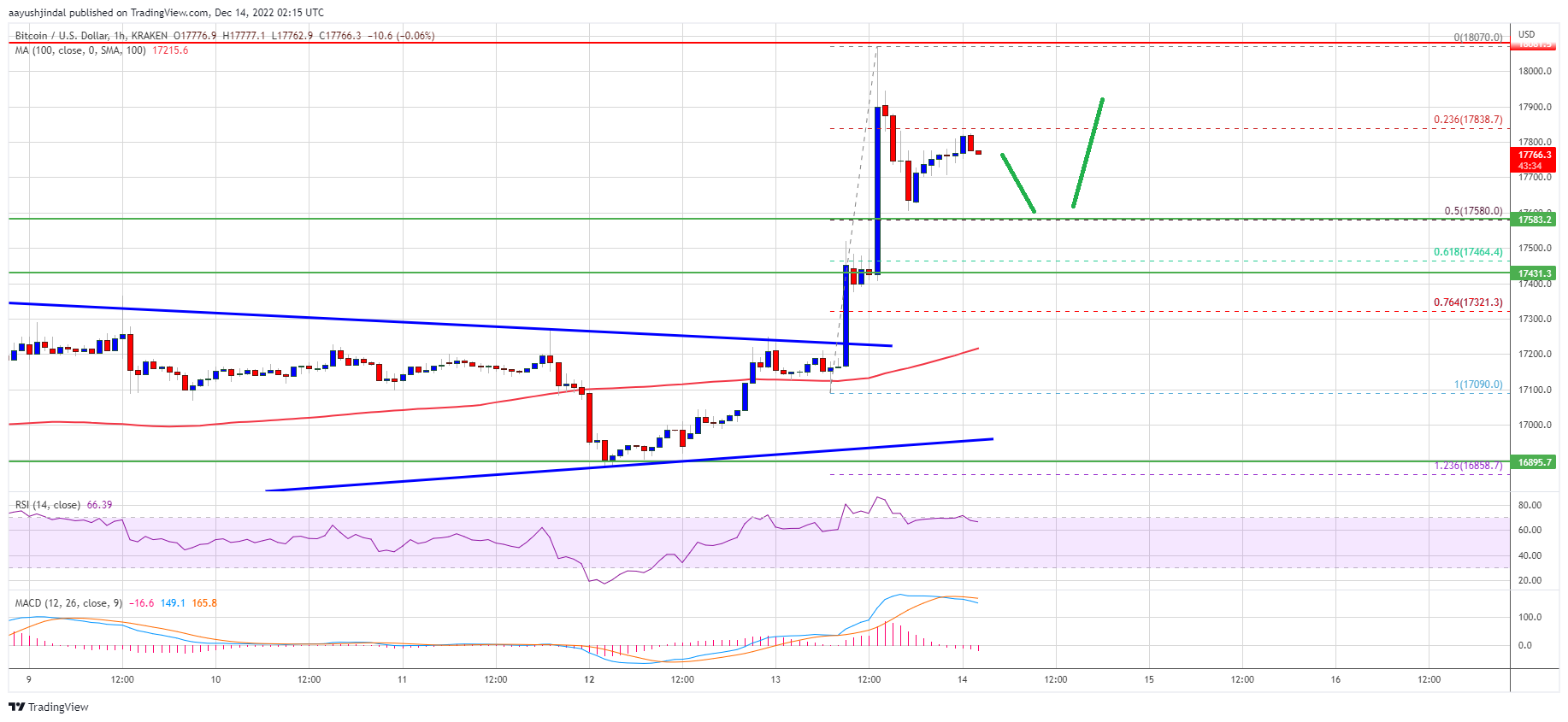 Bitcoin price gained pace above the $17,500 resistance after the US CPI release. BTC tested the $18,000 resistance and might correct lower in the short-term.