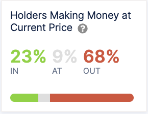 The vast majority of holders, accounting for 68% of all wallets, are seeing losses. The remaining 9% are sitting in the neutral territory, putting them right at the price that they purchased their coins for.