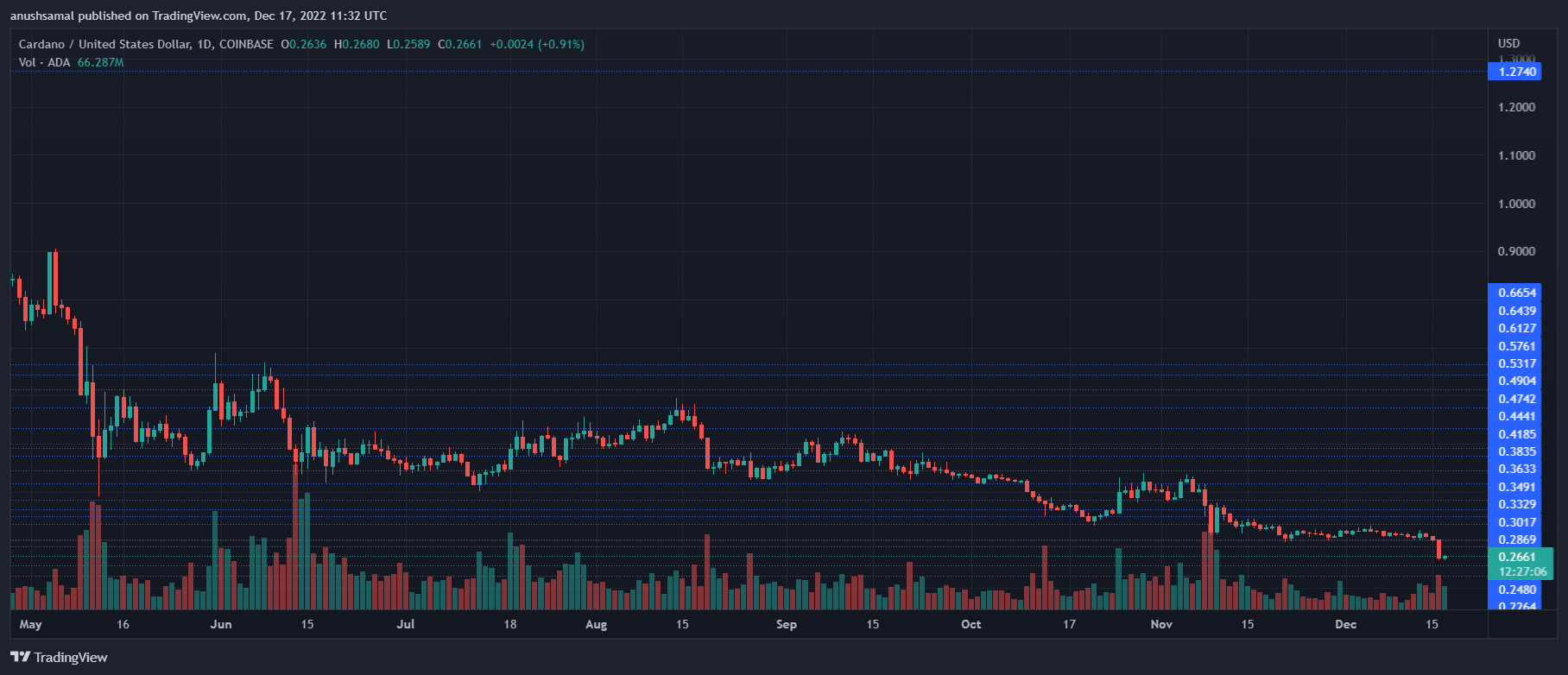 ADA was trading at $0.26 at the time of writing. The altcoin continues to remain slippery ever since it lost the $0.44 support line. As accumulation remained considerably low on the chart, there are chances that the token’s value will drop further.