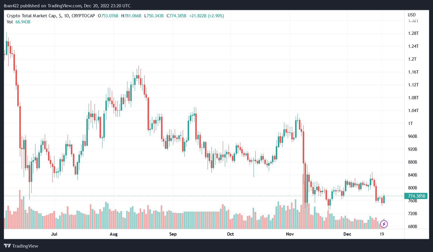 As it stands, crypto traders and investors seemed to have their hands up in resignation. Trading volume across major exchanges has been highly compressed. The general market capitalization across all digital assets is down around 2.6% monthly, at $774 billion.