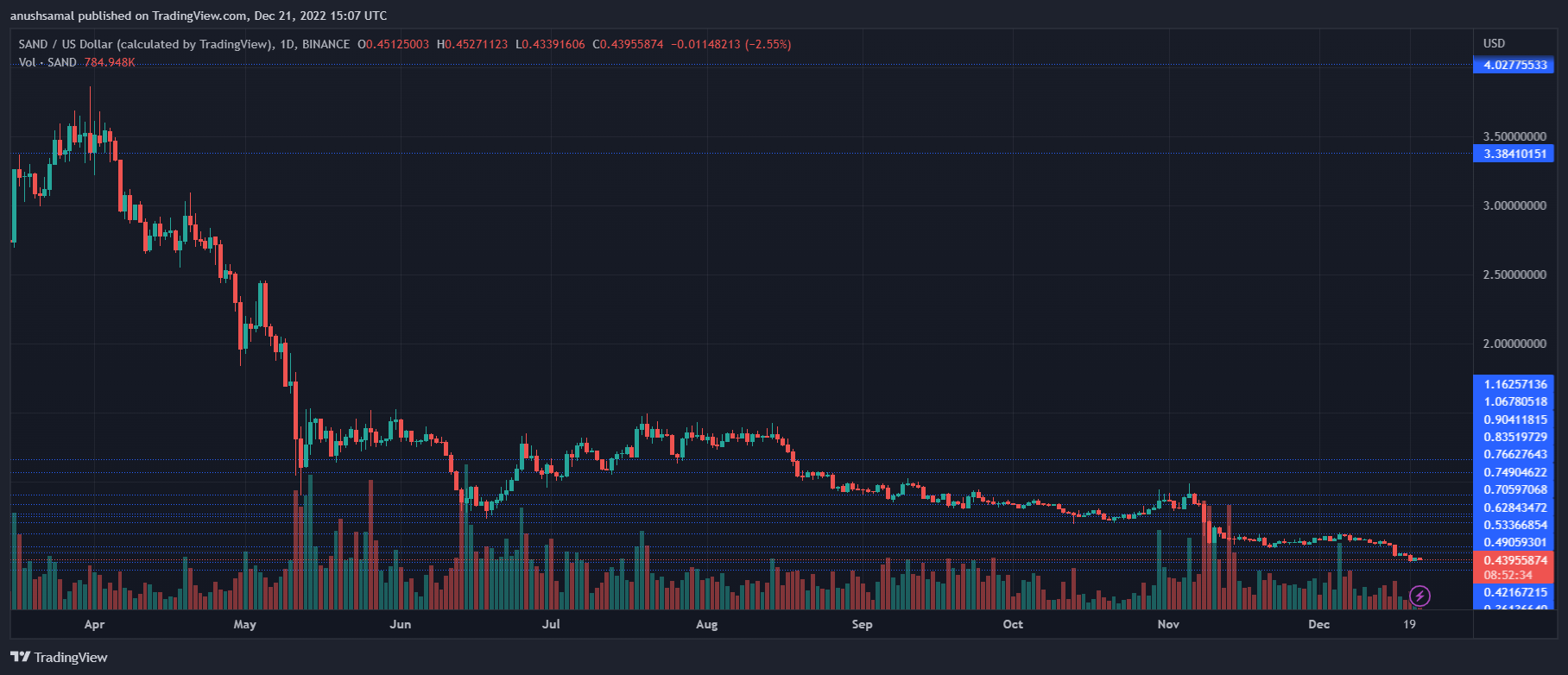 SAND, the SandBox, has been free-falling since the month of August. The coin has registered a severe decline in demand, which has caused the crypto to lose further value. The asset has pierced through various support levels over the past few months. It lost 2.2% of its value in the last 24 hours.