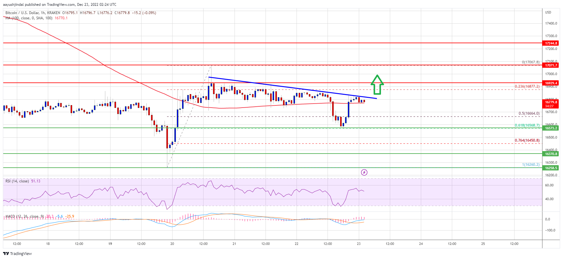 - The price is trading above $16,700 and the 100 hourly simple moving average.