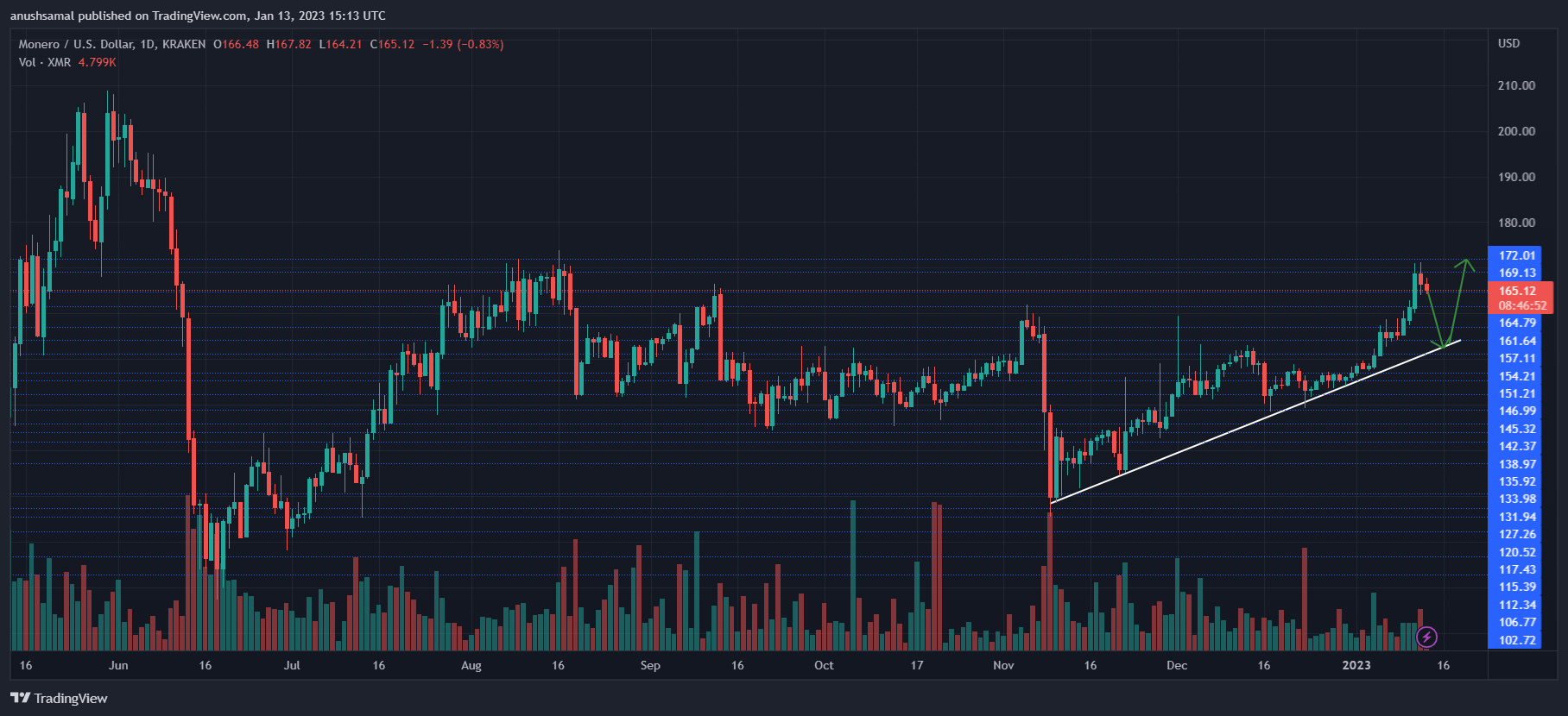 XMR was trading at $166 at press time. Over the last week, the coin secured gains and pierced through various resistance lines. The coin crossed the $157 resistance line and flipped it into a support zone for itself.