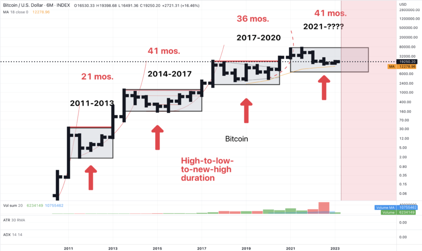 “I do not expect Bitcoin to run away to the upside, but rather work higher toward late 2023/early to mid 2024 when the ATHs are retested,” he explained, sharing the chart above to justify the analysis.