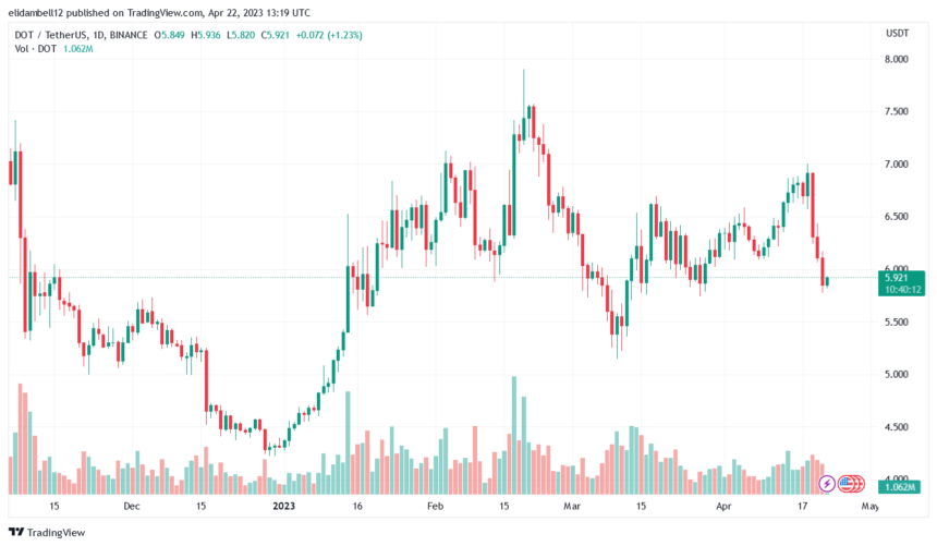 After losing its hold on the price level of $7 in February, DOT has maintained a trading price within the $6 region. As of April 21, the price of DOT dropped to its resistance point of $5.8 before correcting.