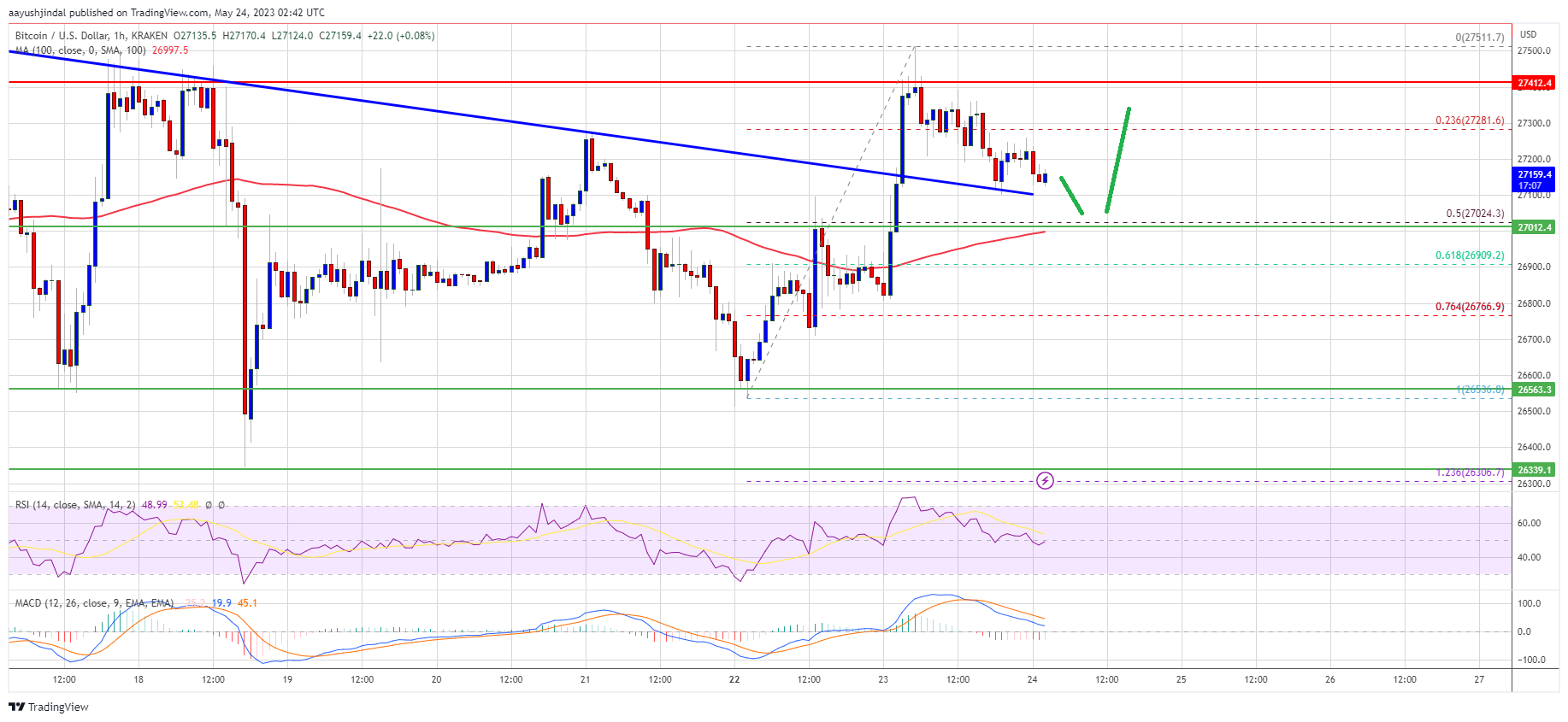 During the increase, there was a break above a major bearish trend line with resistance near $27,140 on the hourly chart of the BTC/USD pair. The pair spiked above the $27,400 resistance but there was no upside continuation. A high is formed near $27,511 and the price is now moving lower.