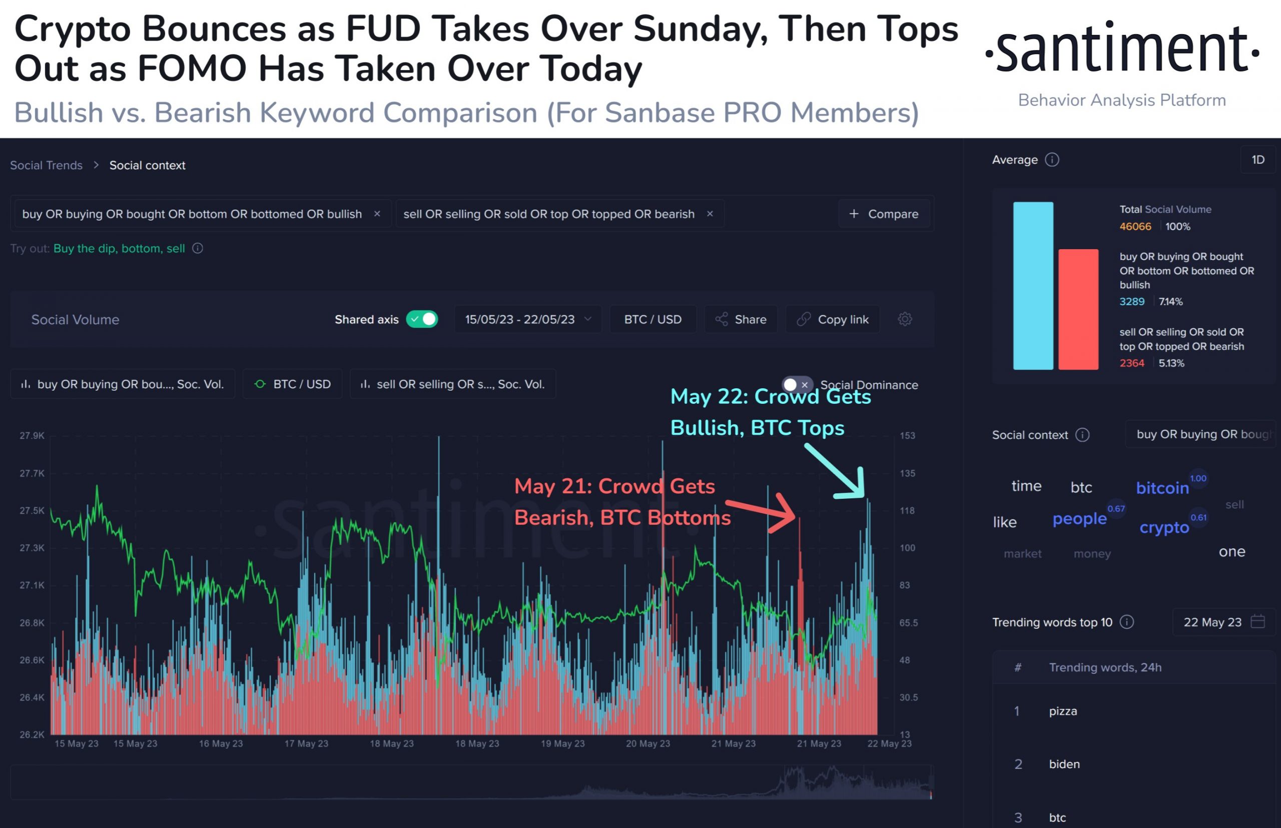 By the time the price went above $27,000, though, the social volume of the greedy sentiment had reached pretty high values. Like when the negative sentiment had become overwhelming, the bottom had formed, a top occurred following this positive mentality spike.