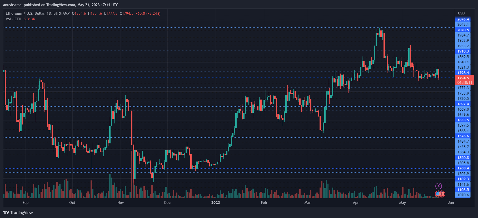 On the other hand, if the present price level experiences a decline, Ethereum is likely to decline further to $1750 before eventually reaching the $1700 price mark. The recent session saw a decrease in the volume of Ethereum traded, indicated by the red colour, indicating a weak buying strength.