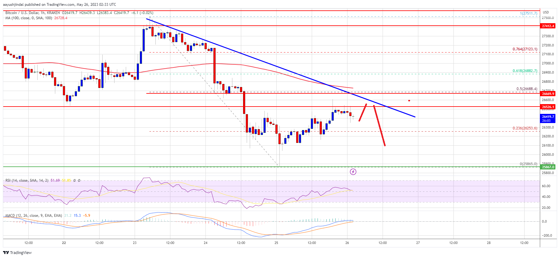 • The price is trading below $26,650 and the 100 hourly Simple moving average.